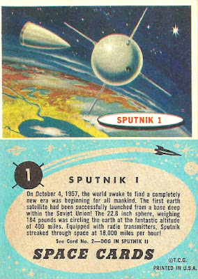 En 1963, Topps sort une série de 55 cartes Astronauts Pictures (dont on parlera une prochaine fois) avec certaines cartes en 3D (popsicle card) - le dos est bleu, appelé Space Cards, identique à notre série - donc, si on ne voit que le dos, c'est trompeur.